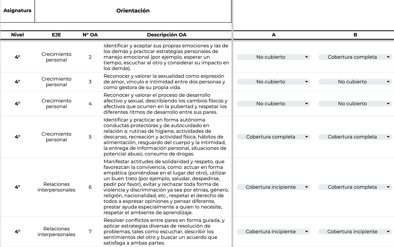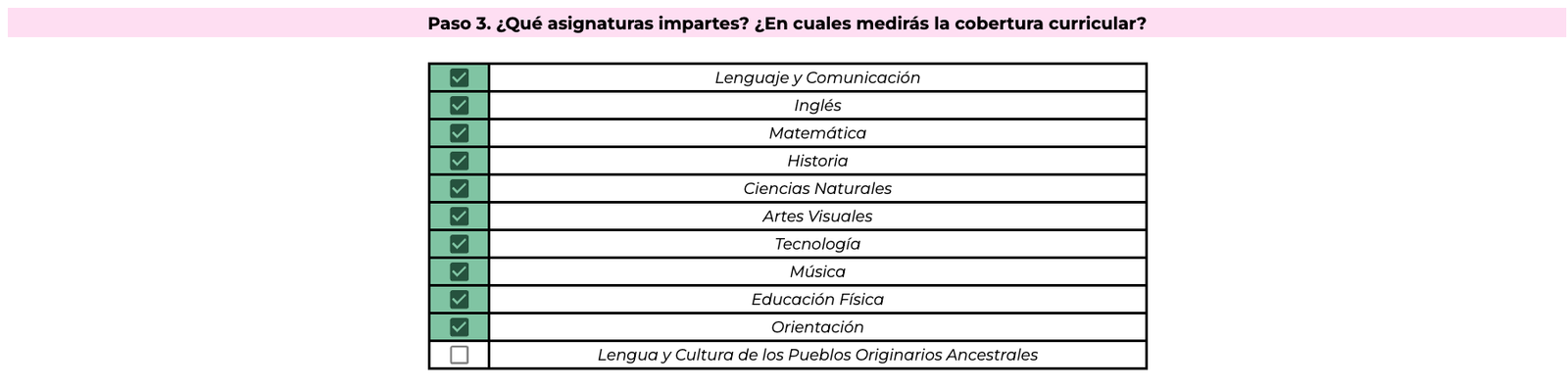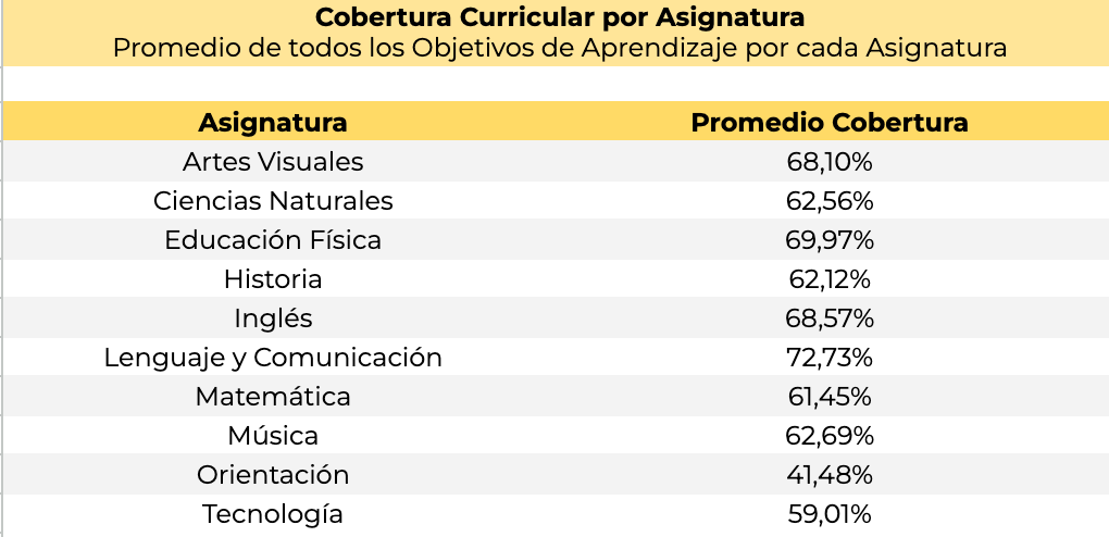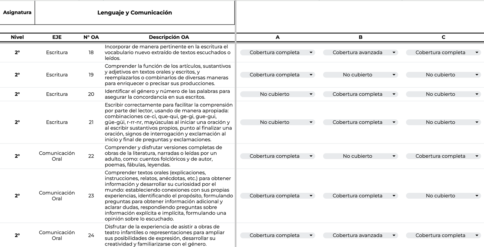 Todas las asignaturas: Incluye OAs de Inglés en todos los niveles (1° a 4° propuesta vigente) y Lenguaje y Comunicación hasta Lengua y Cultura de los Pueblos Originarios Ancestrales). Incluye todas las demás asignaturas del curriculum nacional vigente.