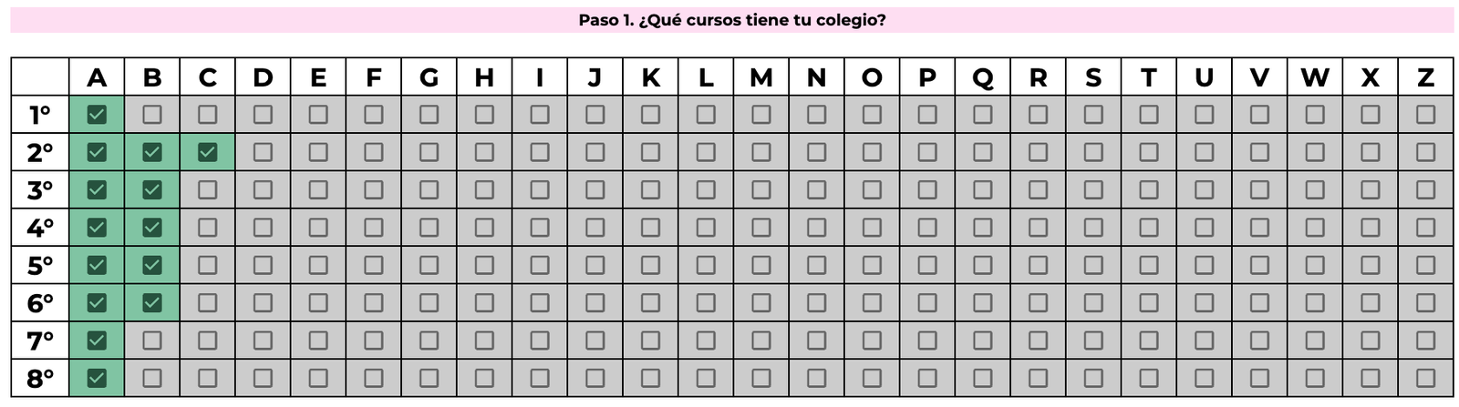 Adaptabilidad Total de Cursos: Selecciona exactamente qué cursos tiene tu establecimiento por nivel (de 1° a 8° básico), con capacidad para gestionar múltiples letras (A hasta la Z).