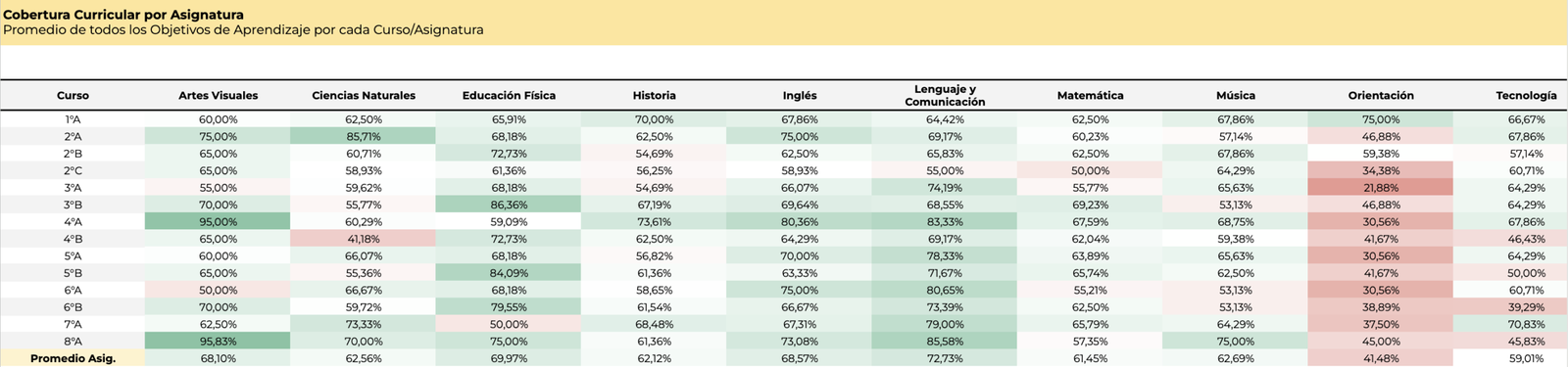 Mapas de Calor: Detecta alertas rápidamente. Las celdas se iluminan de rojo a verde según el nivel de cobertura, permitiéndote identificar cursos o asignaturas críticas en segundos.