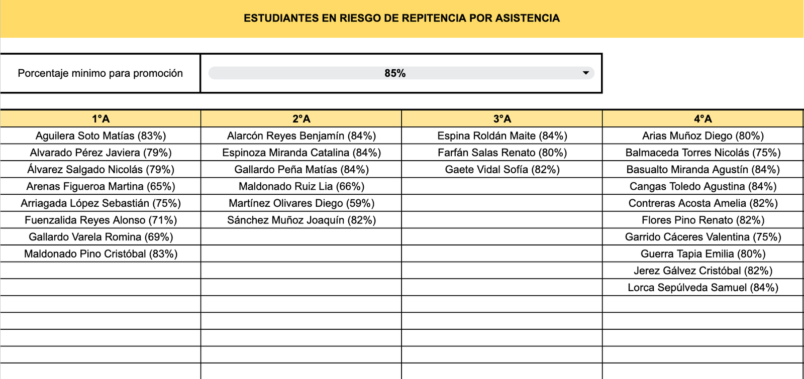 Riesgo de repitencia: muestra estudiantes bajo el umbral configurado (85% por defecto), actualizándose en tiempo real.