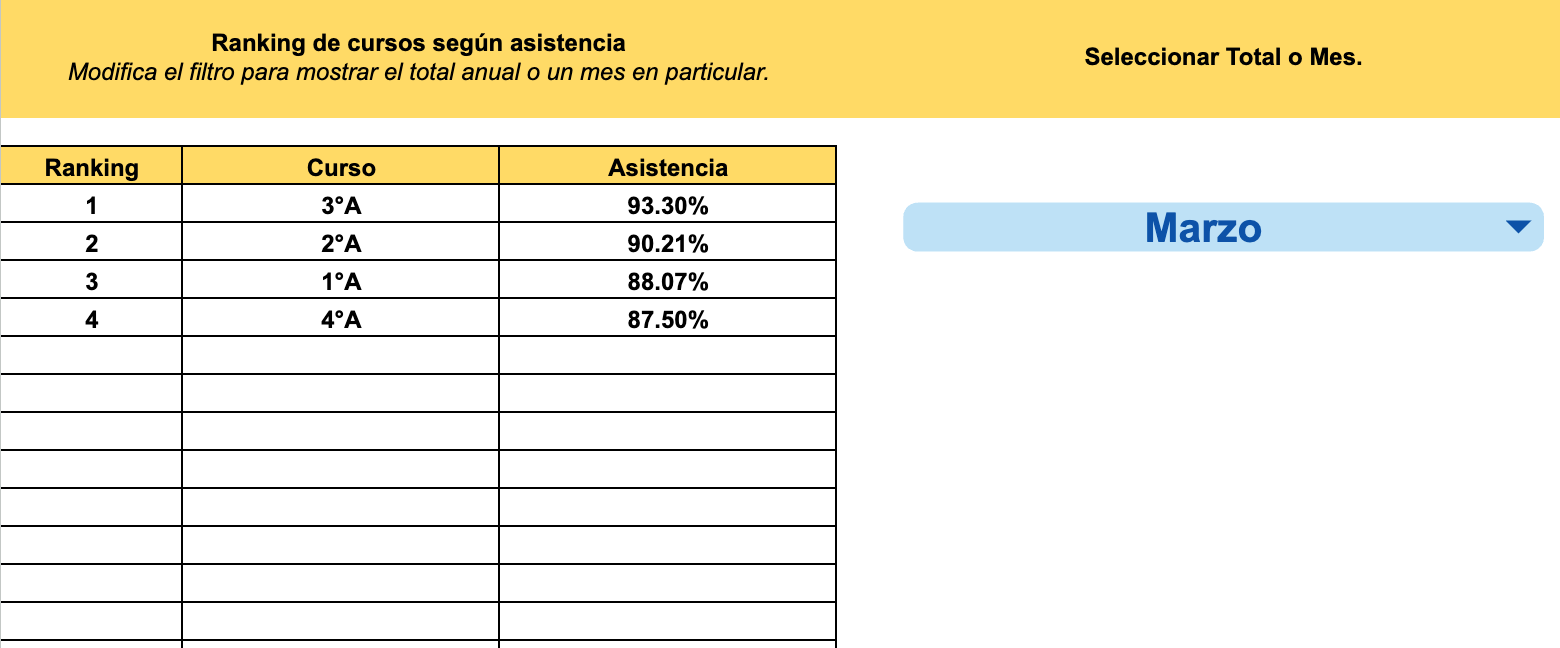 Ranking de asistencia: identifica el curso con mejor asistencia del mes o del año (¡Se actualiza automáticamente mientras registras!=