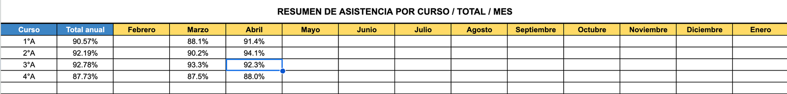 Resumen general con la asistencia mensual y total de todos los cursos en una sola hoja.