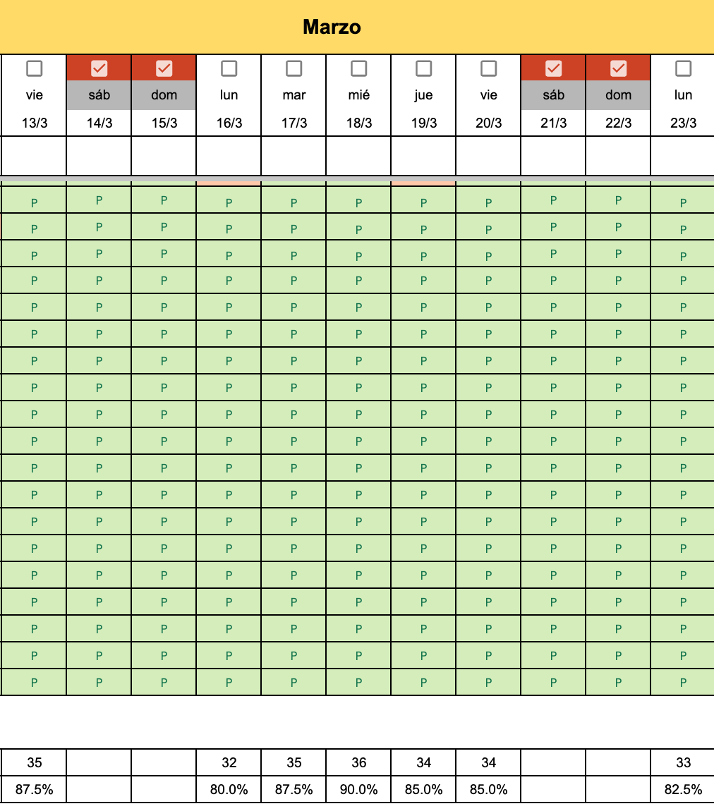 La planilla permite marcar días no hábiles como feriados, fines de semana y días sin clases mediante checkboxes simples y visualmente claros.
