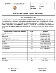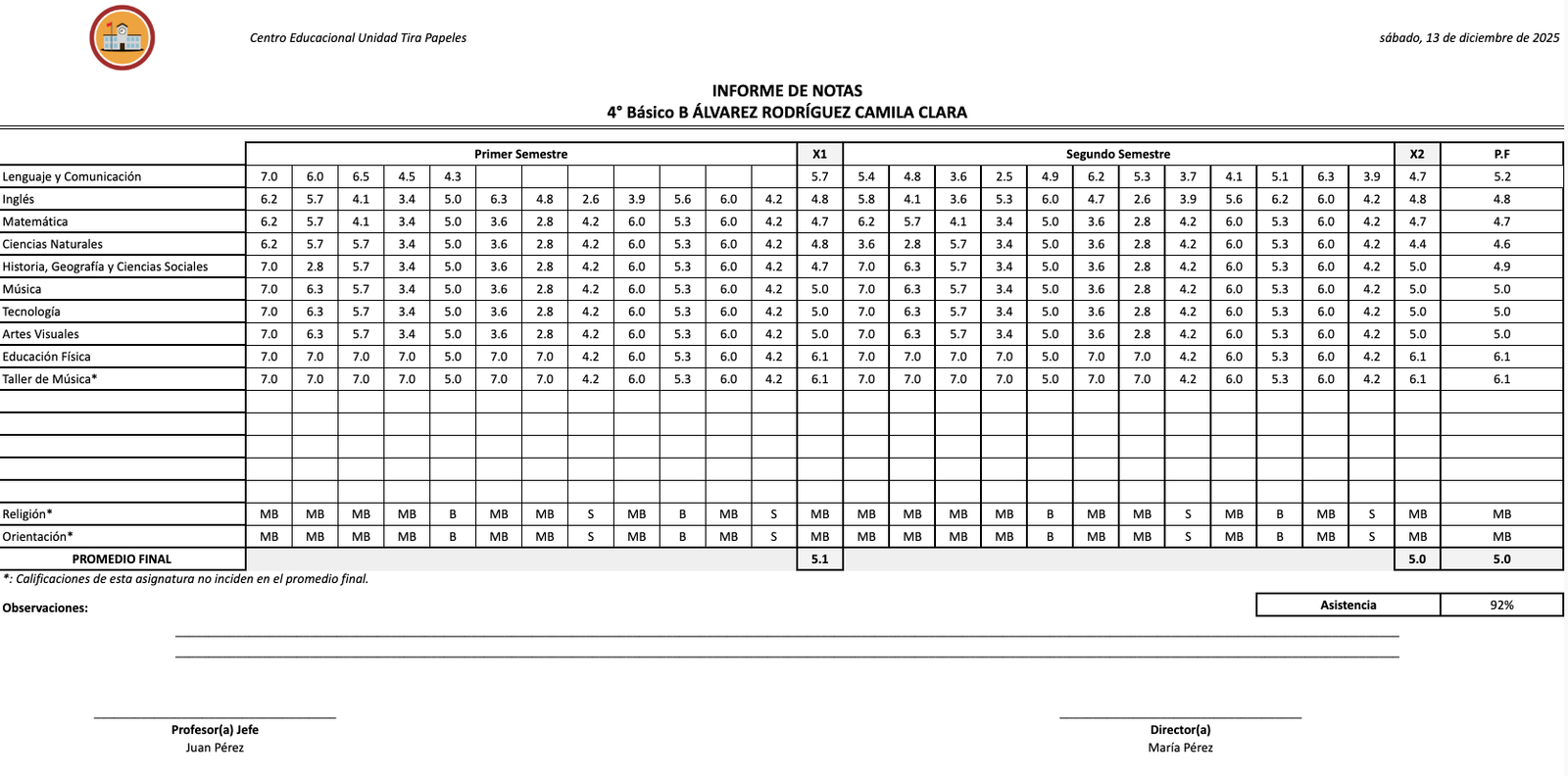 - Permite personalizar los informes de notas con el nombre del colegio, nombre de profesor(a) jefe y director(a)