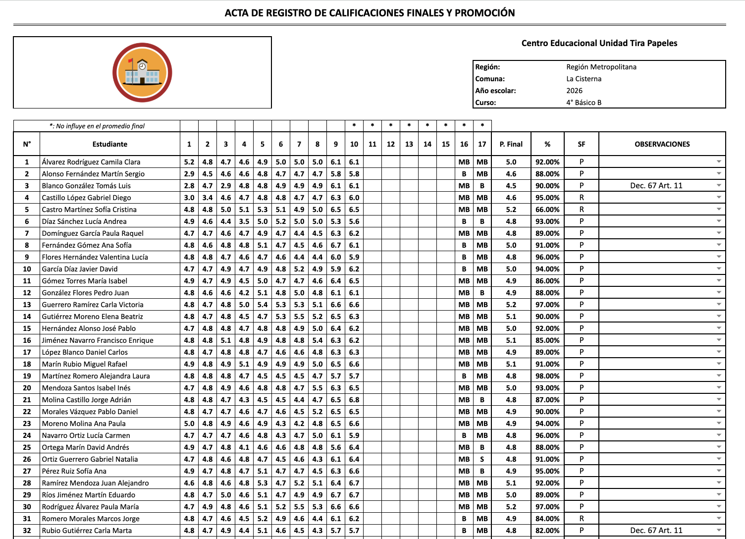 - Acta de situación final: Simula las actas de SIGE – Calificaciones finales de todos los estudiantes, situación final, Observación (ej. Dec. 67 Art. 11)